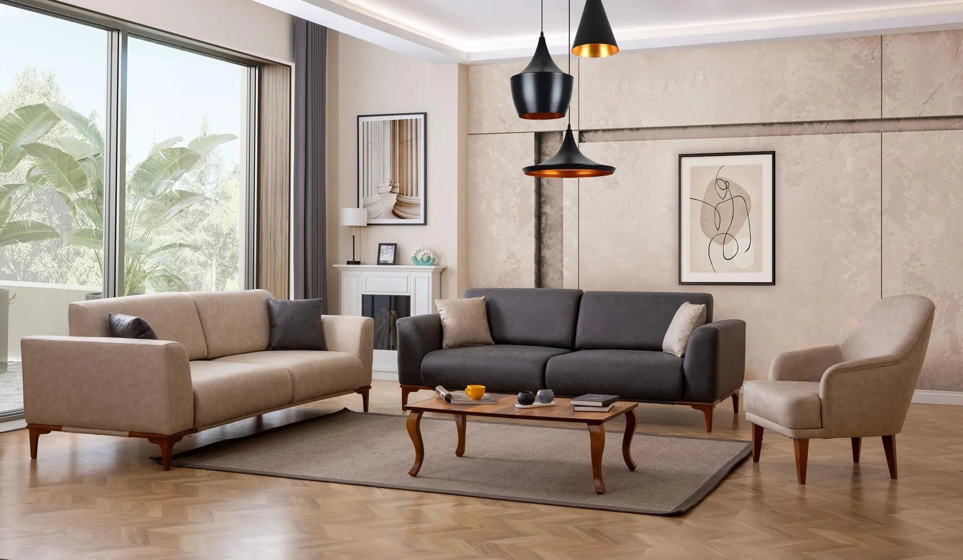 - Комплект: Включва два триместни дивана (3+3) и един фотьойл, създавайки завършен и елегантен сет.