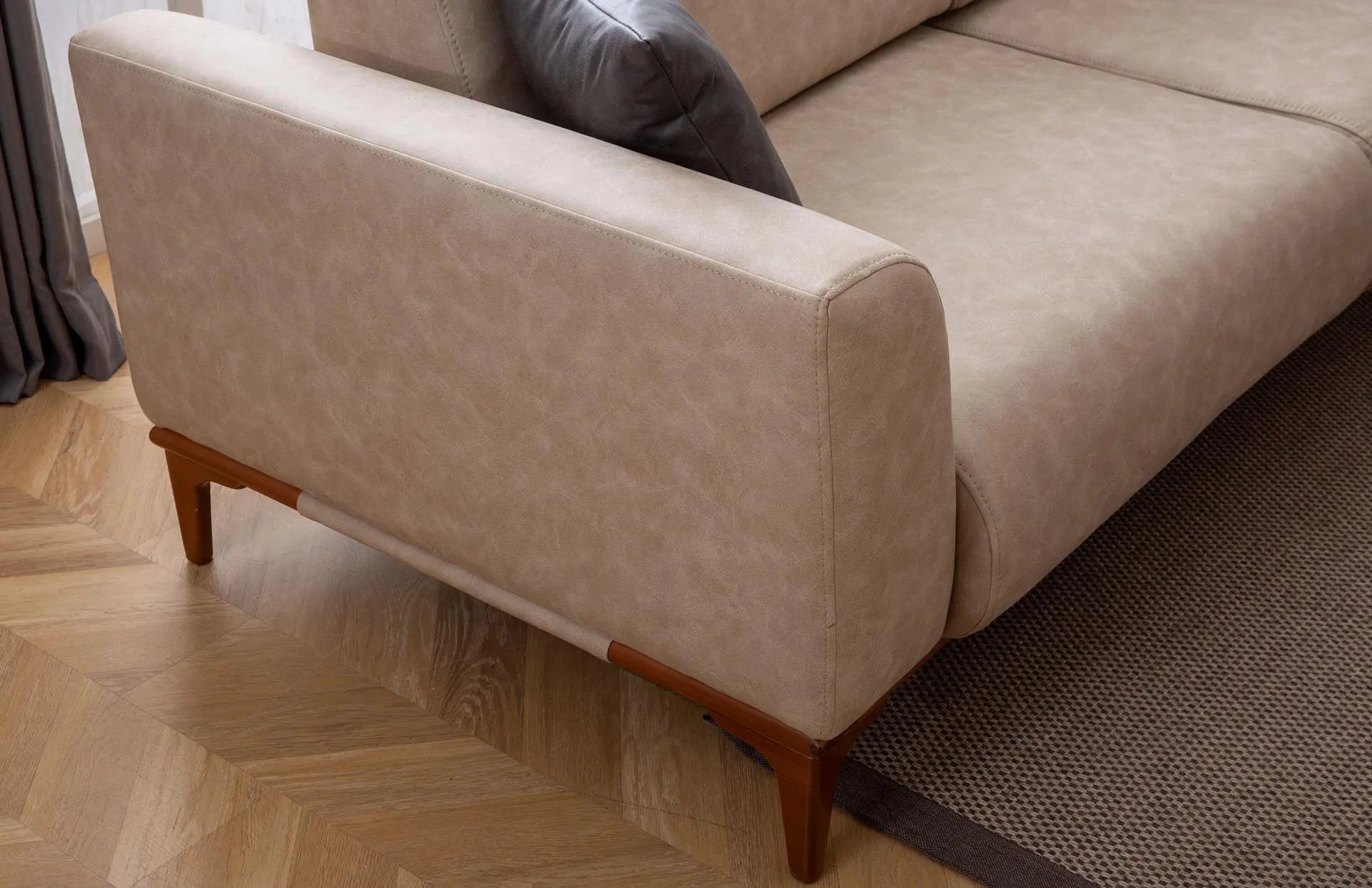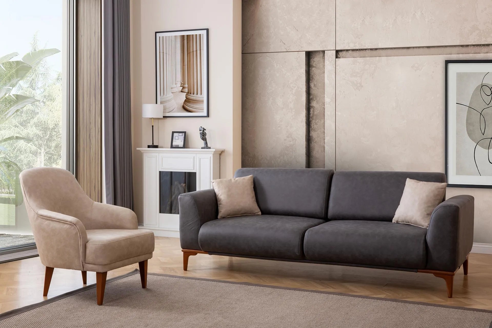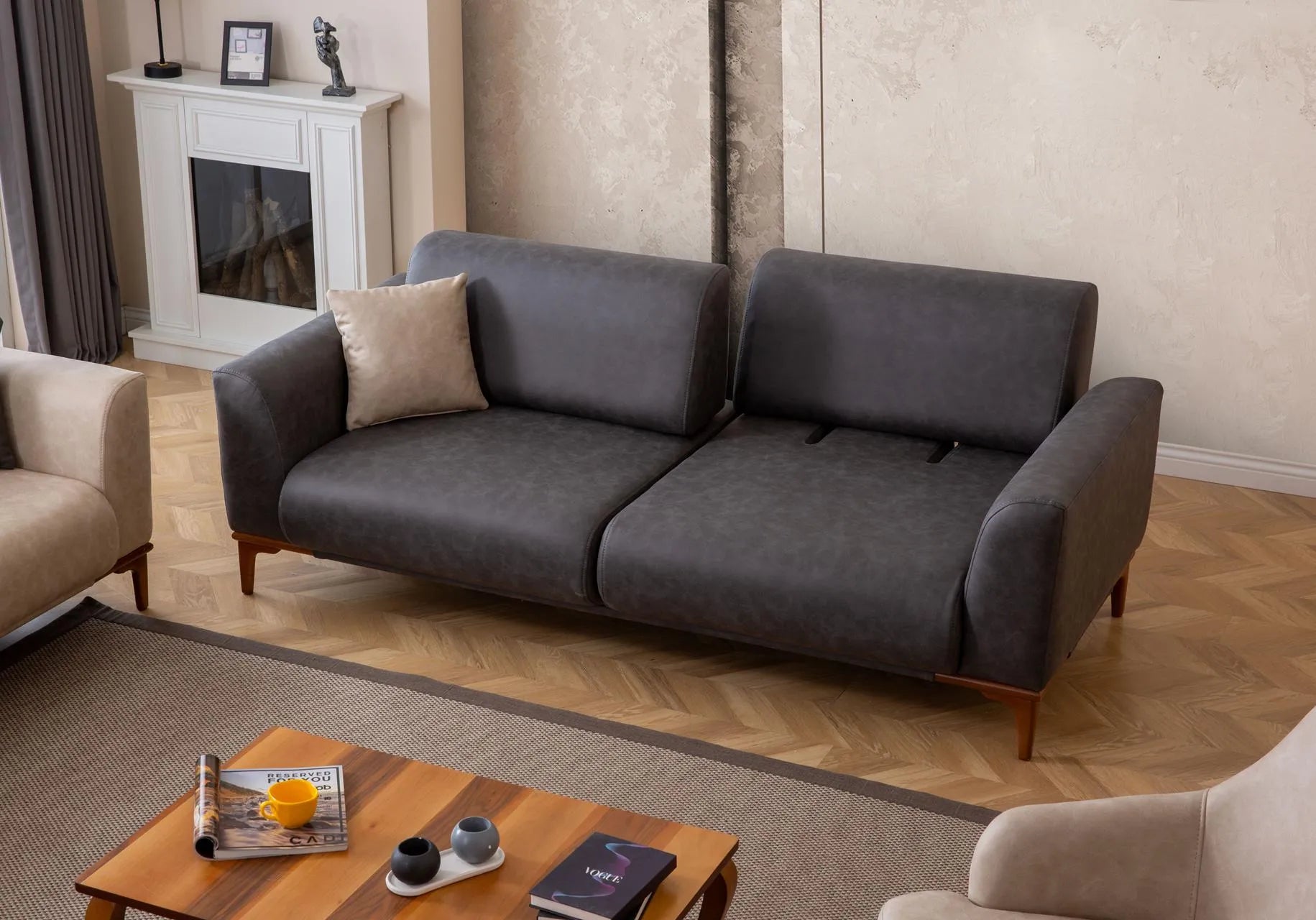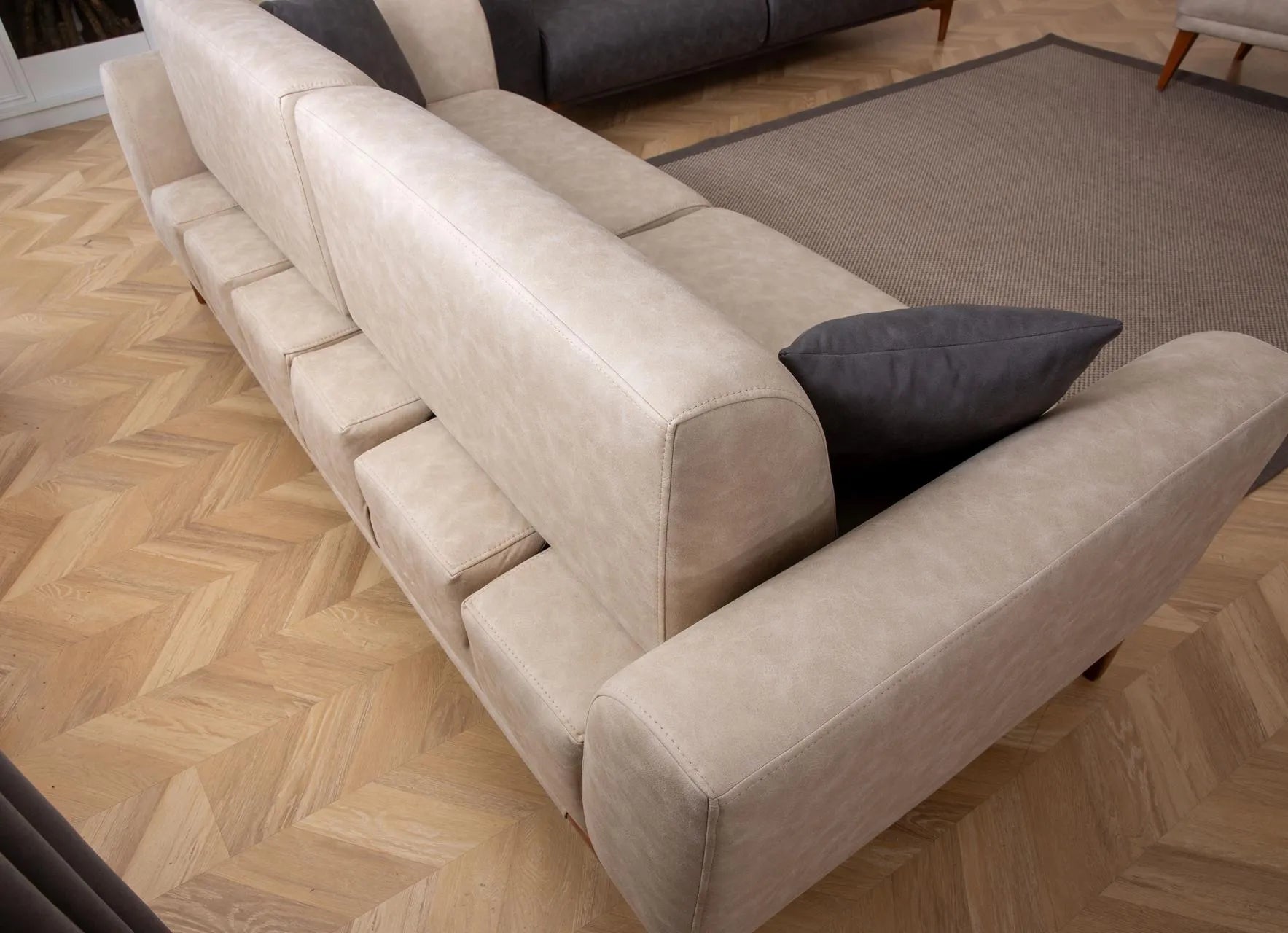 - Цвят: Диваните са тапицирани с плътен велур или луксозен текстил в наситен тъмнсив/светло бежов цвят.