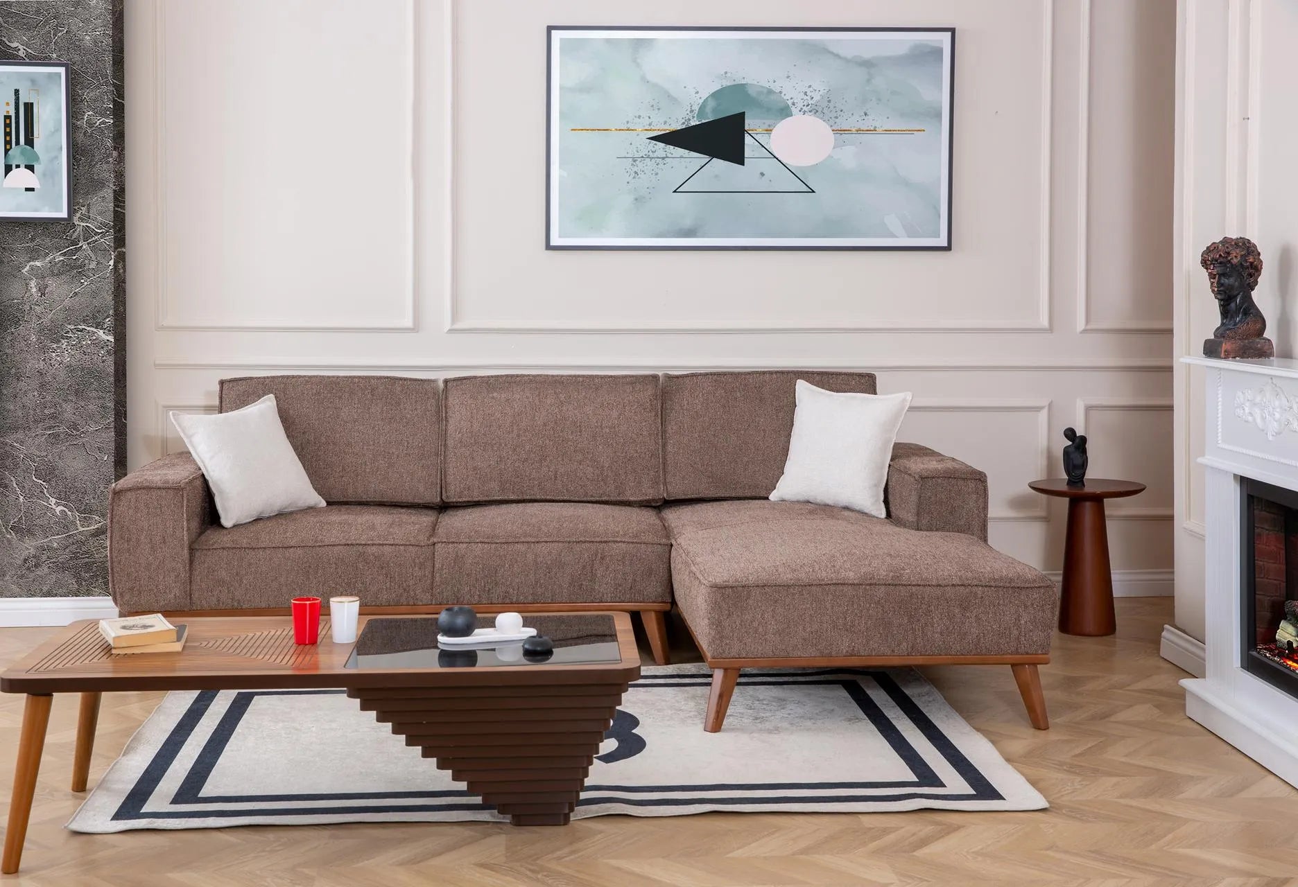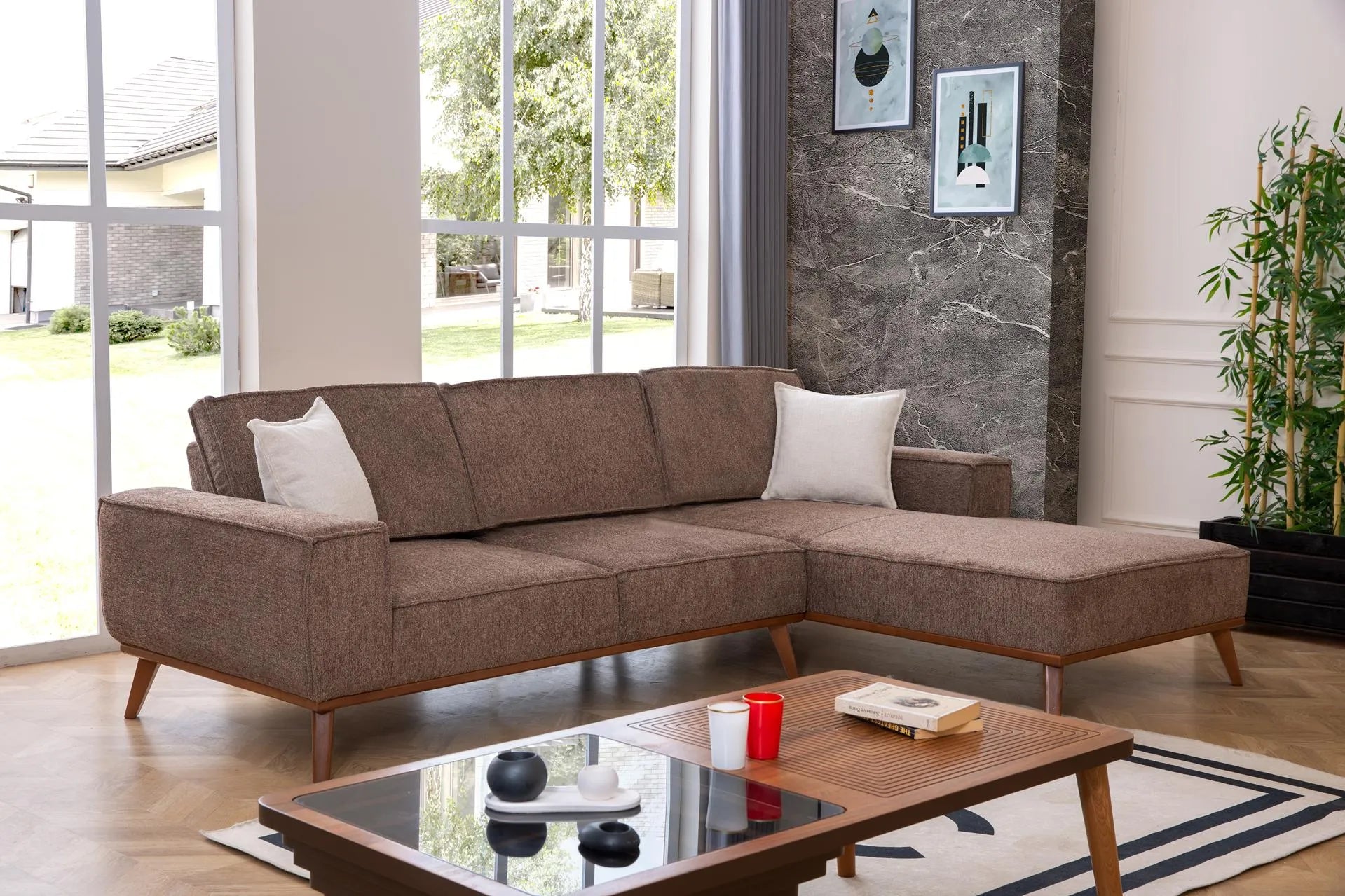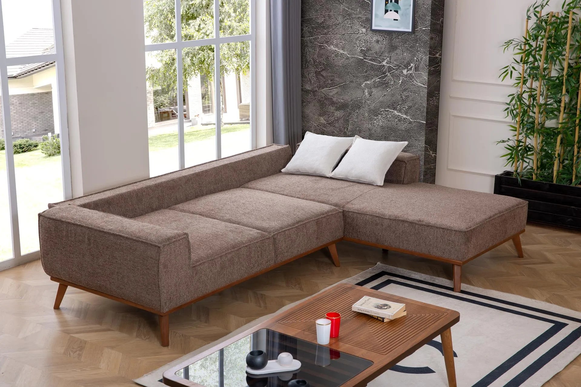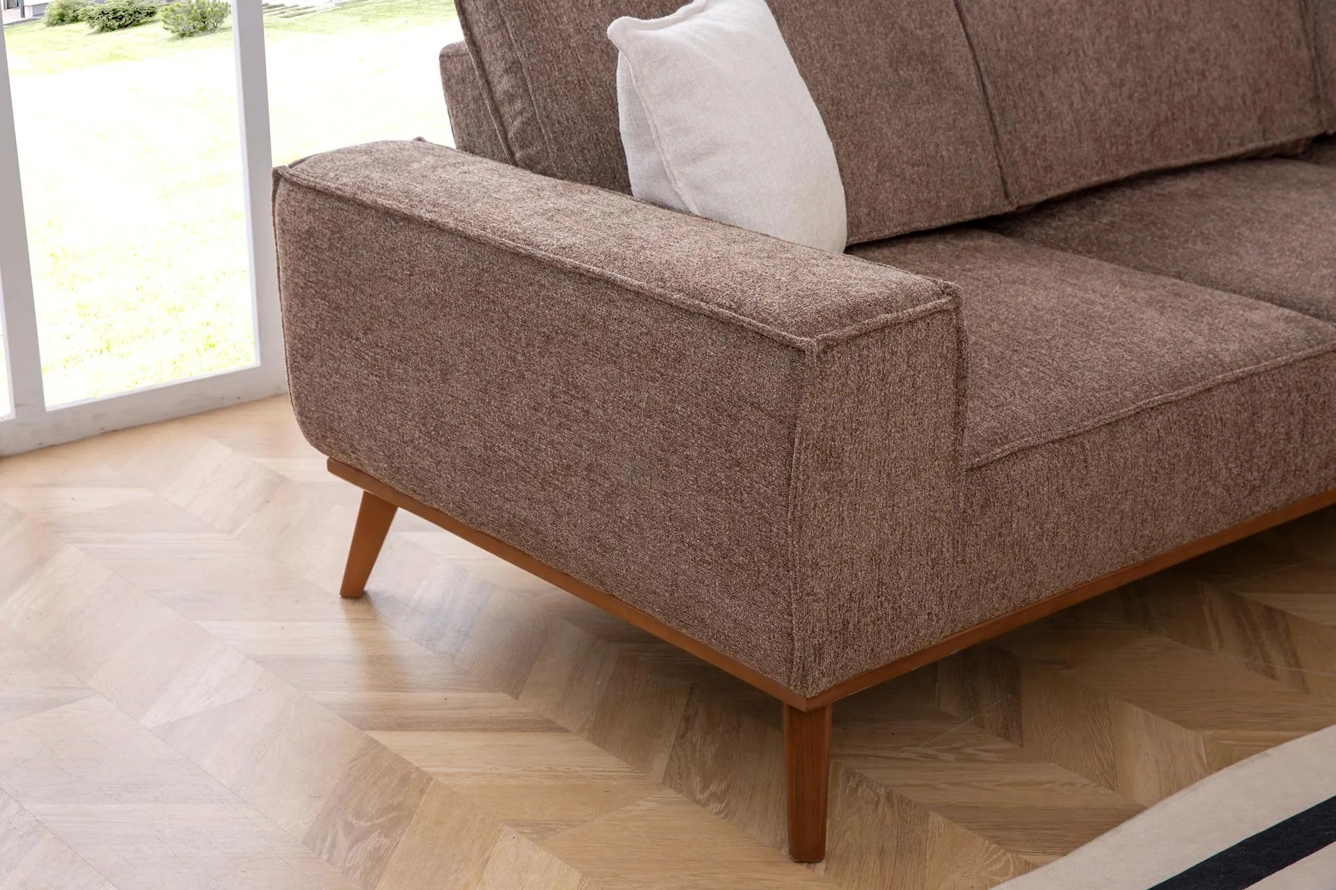 - Дизайн: Има изчистена линия с широки подлакътници и дървени, скосени крачета в топъл тон.